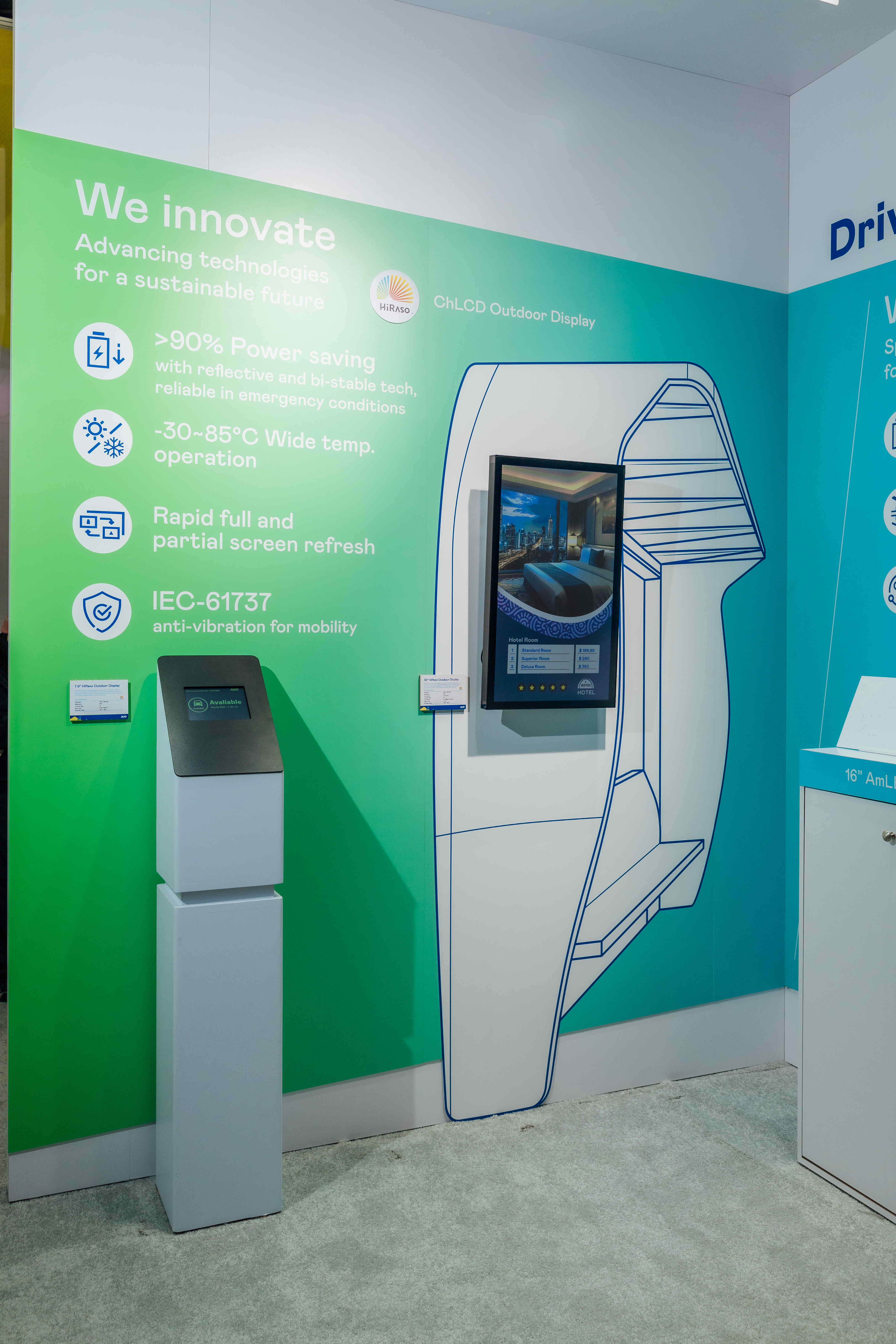 HiRaso膽固醇液晶顯示器運(yùn)用反射環(huán)境光線的方式,呈現(xiàn)影像顯示時(shí)零耗能的環(huán)保省電訴求,光線愈強(qiáng)愈能呈現(xiàn)絕佳的色彩飽和度及顯示效果,同時(shí)在攝氏-30度至85度間寬溫的使用優(yōu)勢(shì),為戶外電子看板的新首選。