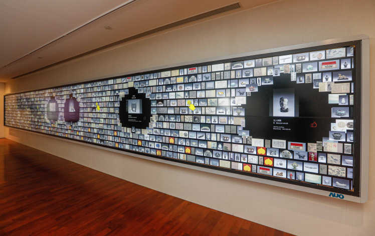 因應全球智慧化文創展演新趨勢,創利空間本次聯手國際動畫界首屈一指的太極影音,整合故宮數位典藏資源,於導覽大廳打造結合科技與人文的智慧博物館互動展示空間。其中包括長達 12 公尺亞洲最大的「文物互動導覽牆」(*),採用 20 片友達 55 吋高規格拼接牆顯示器組成,具有高解析、低反射、極窄邊框的搶眼設計,拼接後的邊框寬度僅1.8mm,以近乎無接縫設計讓參觀者聚焦整體影像內容,享受沉浸式觀賞體驗。互動導覽牆的設計靈感源自故宮多寶格文物,具有直覺友善的使用介面與紅外線感應設計,可讓多人同時透過點選、拖拉、滑動等互動手勢,輕鬆飽覽 300 多件故宮文物精彩的圖像、影片、動畫、360 度環物模型及書法釋文,整合線上線下體驗,吸引觀眾接續前往展間探索實體文物。位於導覽大廳兩側的「展訊輪播牆」則分別由4片55吋拼接牆顯示器所組成,透過螢幕輪播故宮當期展覽與重要活動訊息,讓參觀者得以先睹為快。