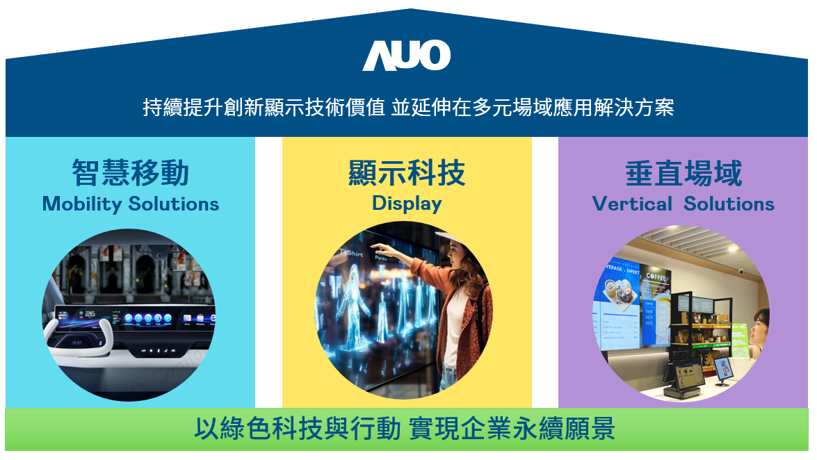我們持續(xù)推動(dòng)「雙軸轉(zhuǎn)型」,在精進(jìn)顯示技術(shù)附加價(jià)值(Go Premium),與深化垂直市場(chǎng)應(yīng)用(Go Vertical)的策略下,對(duì)應(yīng)友達(dá)的優(yōu)勢(shì)競(jìng)爭(zhēng)力與趨勢(shì),我們奠定顯示技術(shù)、智慧移動(dòng)、垂直場(chǎng)域三大永續(xù)營(yíng)運(yùn)支柱,在顯示技術(shù)領(lǐng)域的根基之上,延伸布局多元場(chǎng)域應(yīng)用解決方案。將先進(jìn)顯示科技助力智慧移動(dòng)及垂直場(chǎng)域發(fā)展,並以綠色科技與行動(dòng)為實(shí)踐,在轉(zhuǎn)型之路上貫徹永續(xù)經(jīng)營(yíng)之願(yuàn)景。